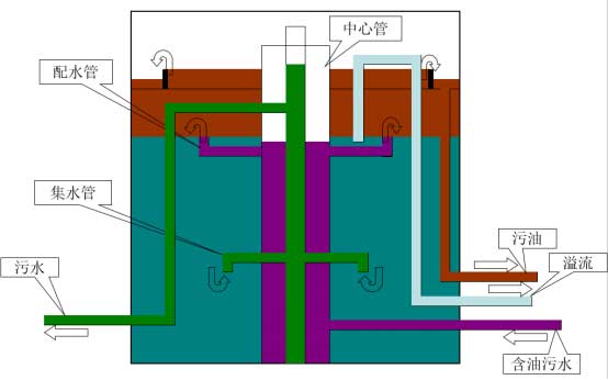 除油罐分為立式斜板除油罐和平流式斜板除油罐,斜板(管)除油是目前常用的高效除油方法之一,它同樣屬于物理法除油范疇。斜板(管)除油的基本原理是“淺層沉淀”,又稱“淺池理論”,設斜管沉淀池池長為L,池中水平流速為~顆粒沉速為在理想狀態(tài)下,LIH=vlu0??梢奓與z;值不變時,池身越淺,可被去除的懸浮物顆粒越小。若用水平隔板.將H分成3層,每層層深為H/3,在〃。與^不變的條件下,只需L/3,就可以將顆粒去除。也即總容積可減少到原來的q#/3。如果池長不變,由于池深為H/3,則水平流速可增加到3%仍能將沉速為m。的顆粒除去,也即處理能力提高3倍。同時將沉淀池分成2層就可以把處理能力提高2倍。這就是20世紀初,哈真(Hazen)提出的淺池理論。為了讓浮升到斜板(管)上部的油珠便于流動和排除,把這些淺的分離池傾斜一定角度(通常為45°~60°),超過污油流動的休止角。這就形成了所謂的斜板(管)除油罐。在理論上,加設斜板不論其角度如何,其去除效率提高的倍數(shù)相當于斜板總水平投影面積比不加斜板的水面面積所增加的倍數(shù)。當然,實際效果不可能達到理想的倍數(shù),這是因為存在著斜板的具體布置、進出水流的影響、板間流態(tài)的干擾和積油等因素。但是,由于斜板的存在,增大了濕周,縮小了水力半徑,因而雷諾數(shù)(Re)較小,這就創(chuàng)造了層流條件,水流較平穩(wěn),同時弗勞德數(shù)(Fr)較大,更有利于油水分離,這就是斜板除油所以成為高效設備的原因。